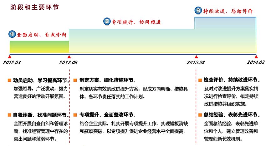 1、找準管理短板和瓶頸問題,實現重點突破。 2、強化向管理要效益理念,切實加強基礎管理。 3、統籌推進專項提升,全面落實整改措施。 4、總結固化成果,構建長效機制。 |